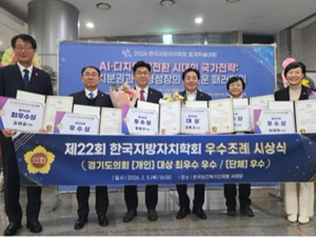 0 투데이코리아=김시온 기자 | 경기도의회가 ‘제22회 한국지방자치학회 우수조례 시상식’에서 전국 최다 수상 기관으로 이름을 올렸다.5일 경기도의회는 최근 충북 청주 한국보건복지인재원에서 한국지방자치학회의 주관으로 열린 ‘제22회 우수조례 시상식’에서 개인부문 대상과 단체부문 우수상 등을 포함해 총 8건을 수상했다고 밝혔다.이번 시상식에서 전국 지방의회에서 32건의 조례가 선정된 가운데 경기도의회가 대상 1건, 최우수상 1건, 우수상 6건을 차지했다.