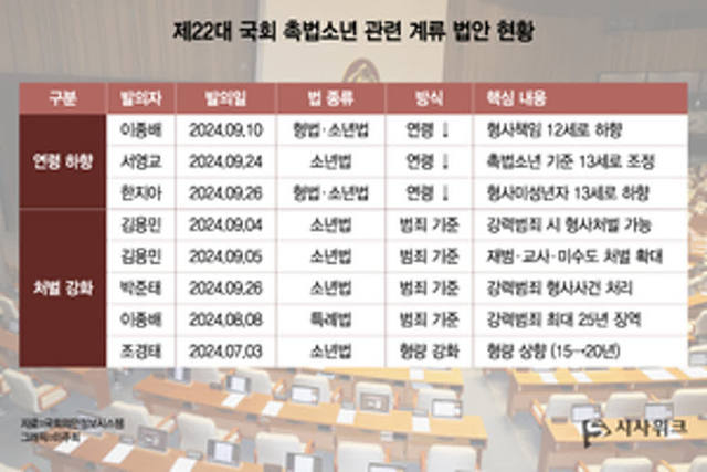 0 시사위크=김두완 기자 제22대 국회에는 촉법소년 제도와 관련한 법안이 다수 계류 중인 가운데, 입법 방향은 크게 ‘연령 하향’과 ‘처벌 강화’로 나뉘고 있다.