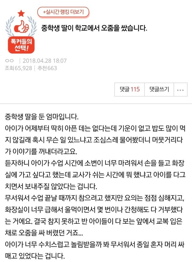 중학생 딸이 학교에서 오줌을 쌌습니다.