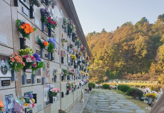 계절이 계절인지라 아버지에게 더 추워지기전에 엄마한테 다녀오자고 했어요.보온병에 커피믹스만 챙겨 출발해 봅니다.가락동에서 용인까지 50분 정도 달려 도착.자리 셋팅이 끝나자마자 엄마에게 커피한잔 올리며 아버지의 인사가 시작됩니다."최 데레사 나왔어. 나와봐"...식은 엄마커피를 내가 마시며 자리정리를 하려고 하는데 오랜만에 뵙는 부부가 다가 옵니다.외아들 만나러 온 겁니다.대학생인데 연구개발로 과로사했다는군요.어디 근처 지나가다 들린건지 빈손이기에 마침 커피도 한개 남아 아드님 드리라고 건네주니 고마워 하시네요.여기 이곳, 사연없는