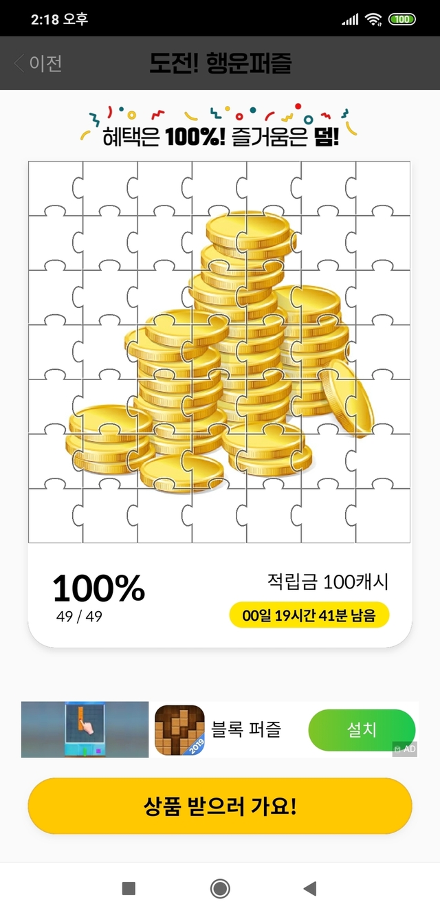 ☺️ 행운퍼즐 100캐시 완성~