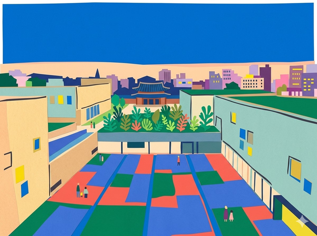 129 이 작품은 국립현대미술관(MMCA) 서울관의 탁 트인 마당과 현대적인 건축미를 앙리 마티스의 '종이 오리기(Cut-outs)' 화풍으로 담아낸 그림입니다. 미술관이라는 공간이 가진 예술적 영감을 마티스 특유의 순수한 색채로 풀어냈죠.색면으로 재구성된 공간감그림 하단의 넓은 마당을 보십시오. 실제 바닥의 격자무늬를 빨강, 파랑, 초록의 대담한 색면들로 치환하여 마치 거대한 추상화 위를 걷는 듯한 기분을 줍니다. 원근법을 단순화하면서도 색채의 배치를 통해 공간의 깊이감을 경쾌하게 살려냈습니다.전통과 현대의 조화로운 실루엣중앙 멀리 보이는