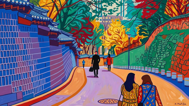 79 이 작품은 서울의 유서 깊은 덕수궁 돌담길을 야수파의 거장 앙리 마티스 특유의 강렬한 색채와 단순한 선으로 재구성한 그림입니다. 차분하고 고즈넉한 실제 돌담길의 분위기가 마티스의 붓끝에서 에너지가 넘치는 현대적인 예술로 변모했습니다.강렬한 블루와 퍼플의 돌담: 왼쪽을 가득 채운 돌담은 실제의 회색조 대신 푸른색과 보라색의 과감한 색면으로 표현되었습니다. 돌 하나하나의 질감을 세세하게 묘사하는 대신, 굵고 명확한 선으로 돌의 형태를 기호화하여 마티스 특유의 리듬감을 살렸습니다.길 위의 따뜻한 빛과 그림자: 길바닥은 화사한 노란색과 연보