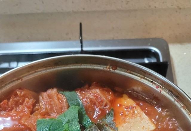 지난주에퇴근하면서김치찌개를 포장해서 사왔습니다.집에 돌아와서맛있는 상상을 하며마늘과 깻잎을 넣고 보글보글 끓였습니다.그런데 기대했던 것만큼의맛은 아니더라고요.그래도 감사히 먹었습니다.