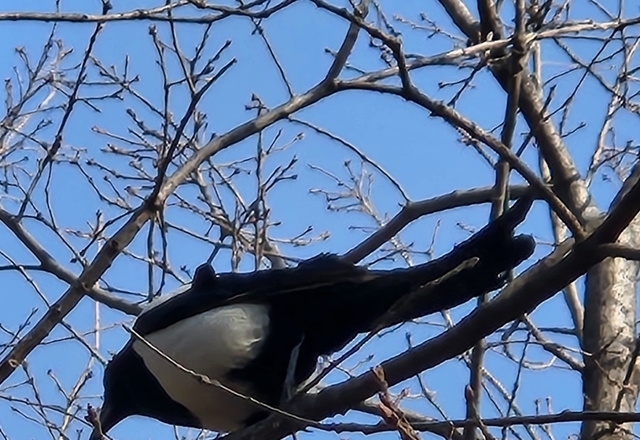 나뭇잎 없는 나무에 애잔하게 앉은 까치