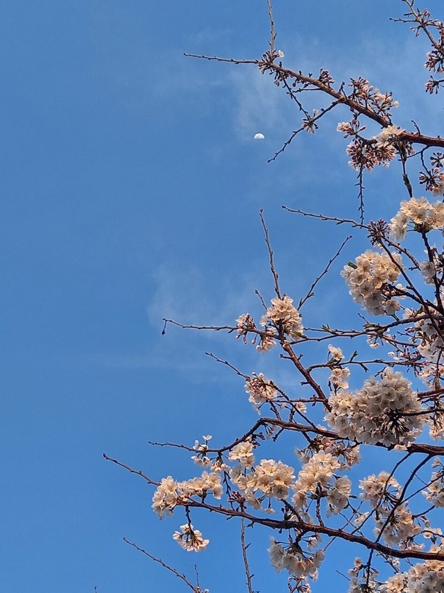 푸른하늘, 벚꽃과 달이네요~~🌸오늘도 고생많으셨어요😊