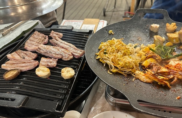 실내 바베큐식당에서 고기 구워먹으니 맛있네요. 케이크는 집에서 따로.