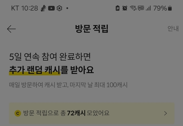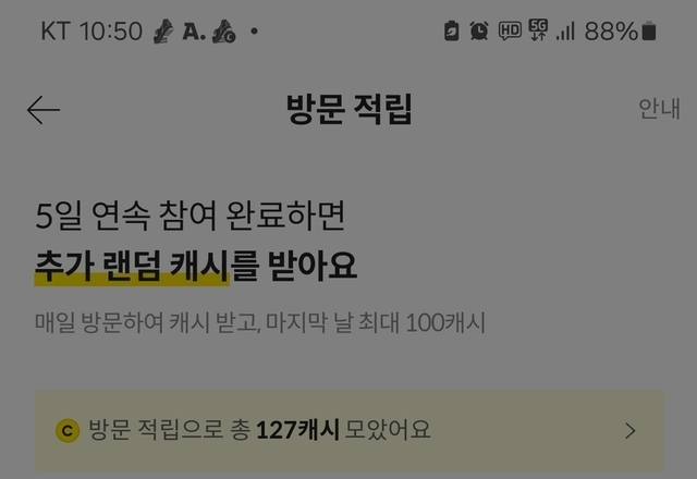 방문적립 5연속 보상으로 10캐시 획득!