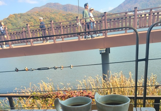 호수에서 향긋한 커피한잔과 독서