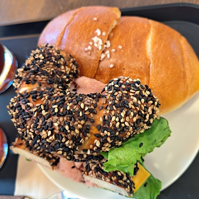 울집앞 베이글 맛집~소금빵도 맛있고 종류도 다양해서골라먹는 재미가 쏠쏠해요~바질베이글도 맛있고,오늘은 션한 아아에소금빵과 참깨 햄치즈베이글😋
