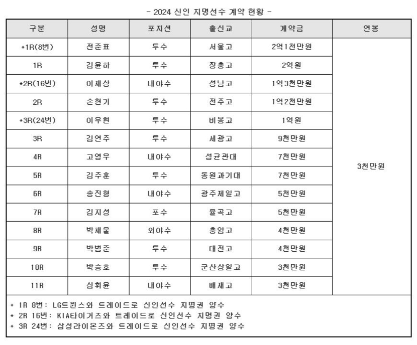이밖에 3라운드 전체 24번 투수 이우현(비봉고)과는 계약금 1억원, 29번 투수 김연주(세광고)는 9천만원에 사인했다.