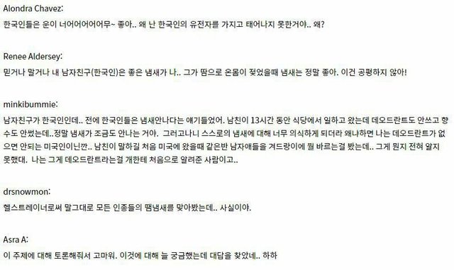 19.11.05 168 읽음 한국인의 암내 수준 하울의음~쥑이는 구독하기 0 1 콘텐츠의 수익 0 2013년 일본 나가사키 대학에서 실시한 연구. AA가 100에 가까울 수록 냄새가 안나는데 한국인은 거의 100%에 가깝게 있어서 냄새가 안남. 물론 표본이 무한대가 아니니 몇몇 예외는 존재하지만 대부분은 외국인과 비교했을 때 거의 안나는 수준 1 0 / 300 입력