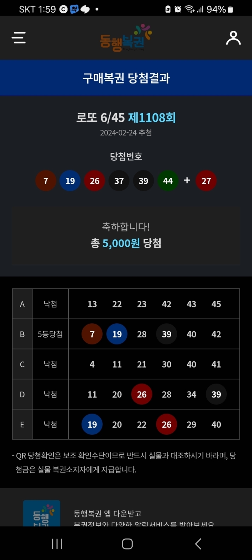 로또 제1108회 5등 당첨
