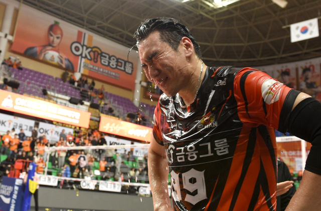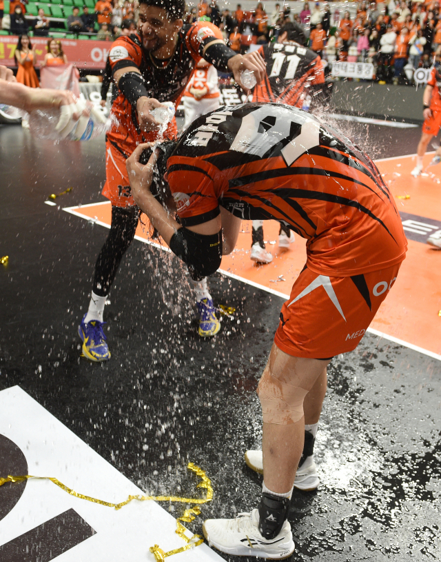 [OK금융그룹의 승리를 이끈 바야르사이한이 PO 2차전을 마치고 물세례를 받고 있다 / KOVO(한국배구연맹)]