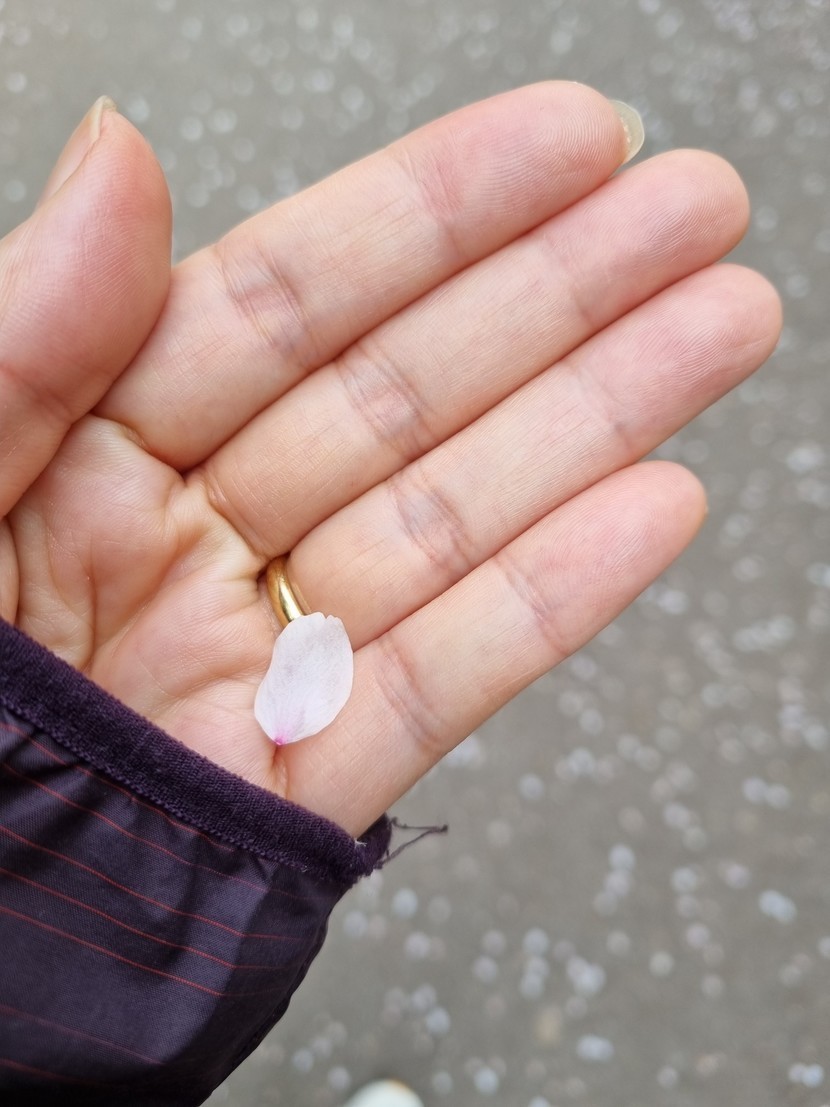 바람이 은근 불어서 오늘 내일 하는 꽃잎들 구경중 손으로 떨어진 하나