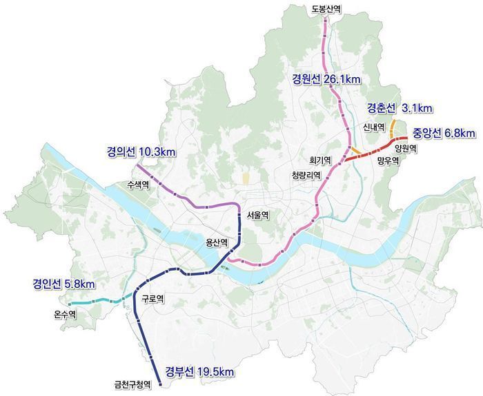 경기도 경부·경인·경의·경원·경춘·중앙·경강·안산선 등 360km 구간을 비롯해 서울시 지상철도의 71.6km 구간이 지하화 사업 대상 노선으로 검토되고 있으며 인천시는 경인선 인천역~구로역(27km) 구간을 검토 구간으로 보고 있다.
