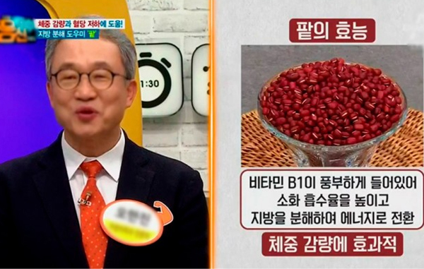 몇 년 전부터 박신혜, 이하늬, 김슬기 등 다양한 연예인들이 팥을 이용한 다이어트로 체중감량에 뛰어난 효과를 봤다고 말한 적 있다. 특히 빅뱅의 탑은 팥물 다이어트로 40일 만에 20kg을 감량했다고 밝혀 화제가 되기도 했다.