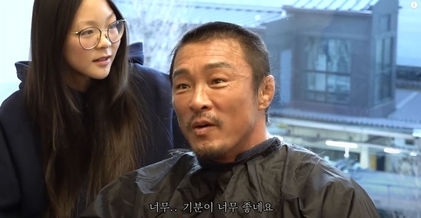 추성훈은 "18살 고등학교 때 삭발하고 30년 만에 처음이다"며 "사랑이가 해주니까 삭발이 기분 나쁘지 않다"고 애써 담담해했다.