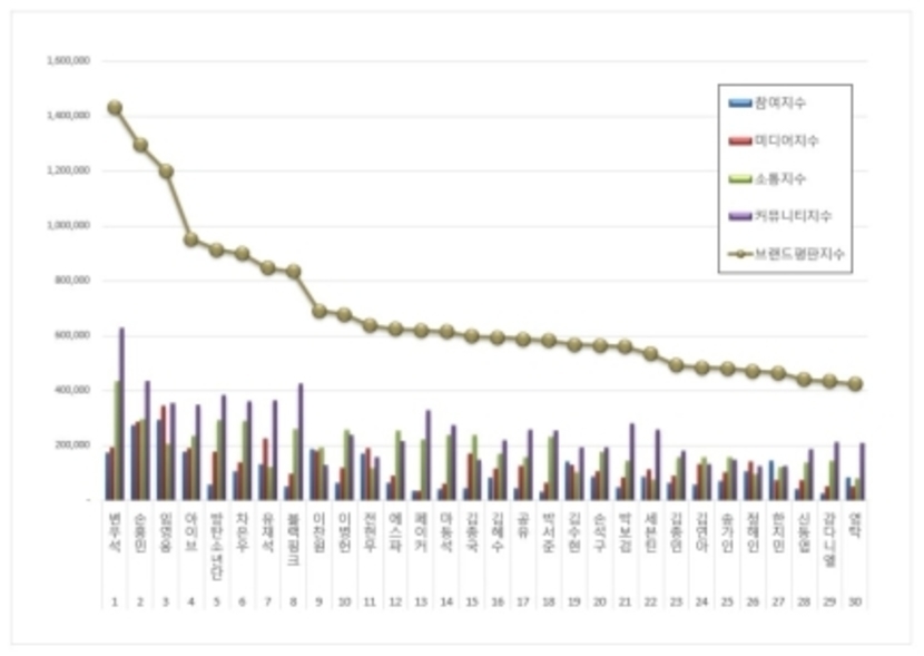 임영웅 브랜드는 참여지수 294,682 미디어지수 343,734 소통지수 206,468 커뮤니티지수 354,401이 되면서 브랜드평판지수 1,199,285로 분석됐다.