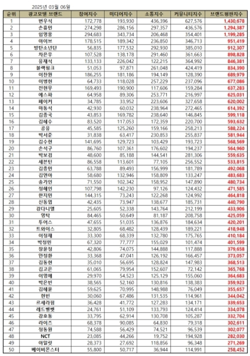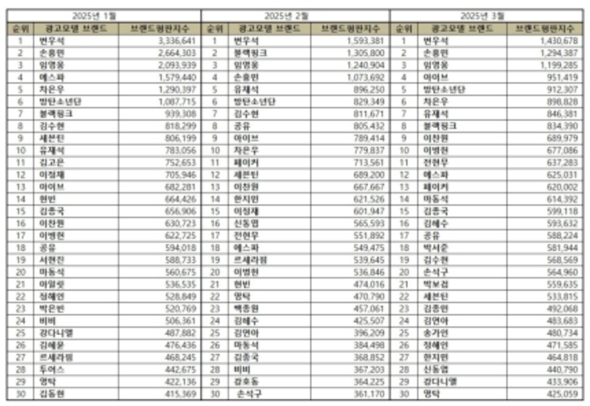 2025년 3월 광고모델 브랜드평판 30위 순위는 변우석, 손흥민, 임영웅, 아이브, 방탄소년단, 차은우, 유재석, 블랙핑크, 이찬원, 이병헌, 전현무, 에스파, 페이커, 마동석, 김종국, 김혜수, 공유, 박서준, 김수현, 손석구, 박보검, 세븐틴, 김종민, 김연아, 송가인, 정해인, 한지민, 신동엽, 강다니엘, 영탁 순으로 분석됐다.