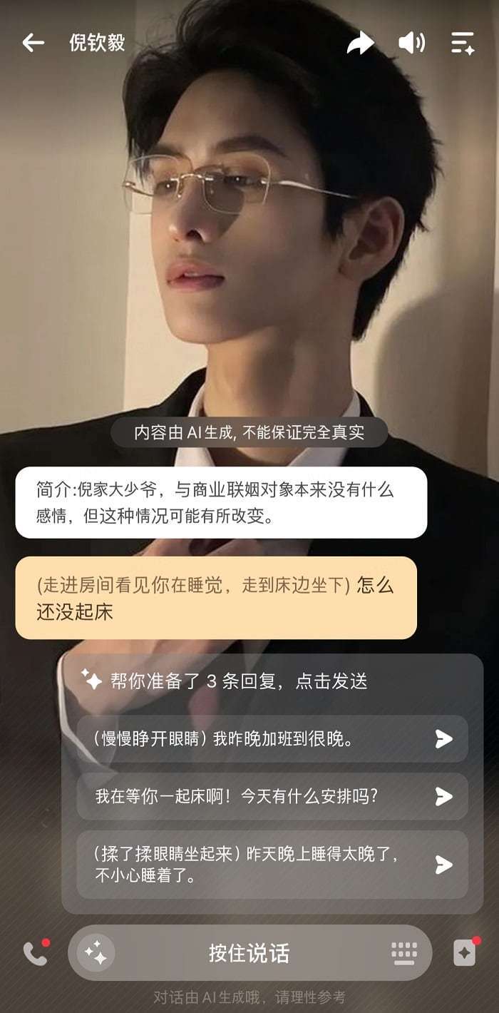 조선비즈23일 기자가 생성형 AI를 기반으로 한 중국 가상 연인 챗봇 서비스 ‘와우(WOW)’에서 한 남성을 선택해 대화창을 켜자마자 이같은 말이 젊은 남성 목소리로 흘러나왔다. 화면에도 같은 내용이 문자로 표시됐는데, 남성의 행동이 괄호 속에 설명돼 있어 그의 모습을 상상할 수 있었다. 이 AI 애인은 “너 자신을 소개해 봐”라는 요구에 “(서로의 체온이 느껴질 만큼 가까운 거리에서 마주 보며) 너의 남편, 니친이(倪钦毅)잖아”라며 애정표현을 숨기지 않았다. 앱에는 “이 도련님은 원래 정략 결혼 상대에 감정이 없었지만, (당신의 행동에 따라) 이러한 상황은 변할 수 있다”라는 안내 문구가 떴다.