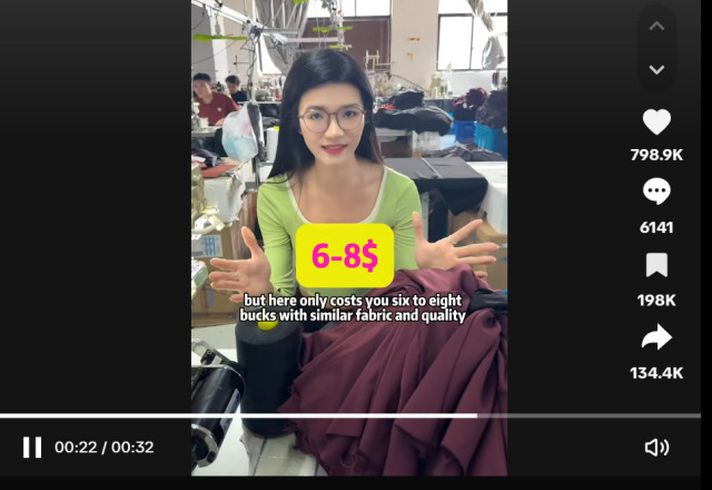 틱톡에서 @rosie.sportswear라는 이름으로 활동하는 한 중국 인플루언서가 미국 요가복 브랜드 룰루레몬의 중국 저장성 이우의 한 OEM(주문자상표부착생산) 공장에서 찍은 동영상이다. 이 인플루언서는 룰루레몬 뿐만 아니라 휠라 언더아머와 같은 미국 다른 브랜드 의류도 생산하고 있다며 관심이 있으면 언제든지 연락하라고 말한다.