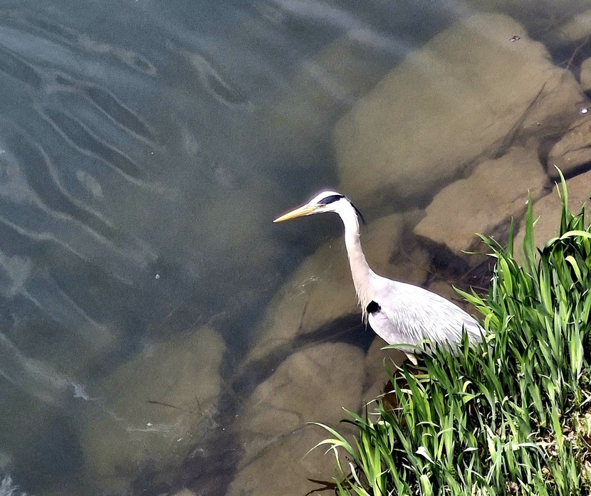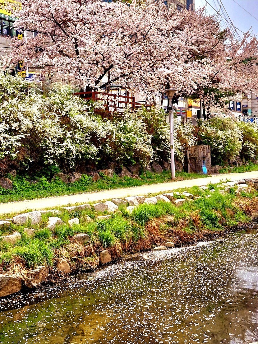 개천에 벚꽃잎이 많이 떨어져있어요.