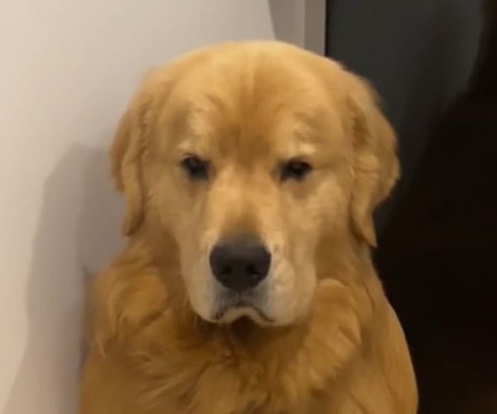 외출 나갔다가 집에 돌아온 집사의 몸에서 평소와 다른 낯선 강아지 냄새가 나자 표정이 서서히 어두워지기 시작한 골든 리트리버 강아지가 있습니다.