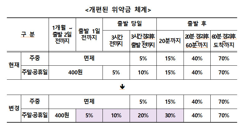 이번 개편안으로, 열차 출발 시각 기준 1일 전 위약금은 5%가 됐다. 출발 당일 3시간 전까지는 10%, 3시간 후부터 출발 시각 전까지 20%, 출발 후 20분까지 30%로 위약금 체계를 강화한다. 변경된 위약금 기준은 한 달간 이용객 홍보를 거쳐 5월 28일 출발하는 열차부터 적용된다.