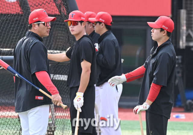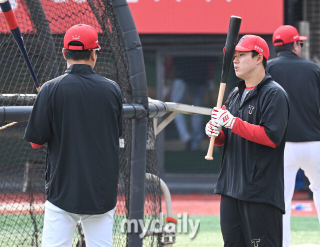 21일 오후 경기도 수원시 조원동 수원kt위즈파크에서 진행된 '2025 프로야구 KBO리그' kt위즈와 KIA타이거즈의 경기. 기아 최원준이 경기전 훈련에서 김주찬 코치와 이야기를 나누고 있다./수원=송일섭 기자 andlyu@mydaily.co.kr[마이데일리 = 수원 김진성 기자] KIA 타이거즈 외야수 최원준(28)이 이범호 감독으로부터 문책성 교체를 당했다.