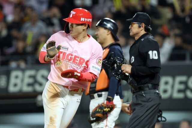 외야수가 무조건 처리해야 할 타구였다. 3루 덕아웃의 이범호 감독 표정이 갑자기 굳어졌다. 결국 김주찬 벤치코치가 그라운드로 나오더니 심판진에 교체 사인을 냈다. 김호령이 우익수로 투입됐고 최원준은 교체됐다.