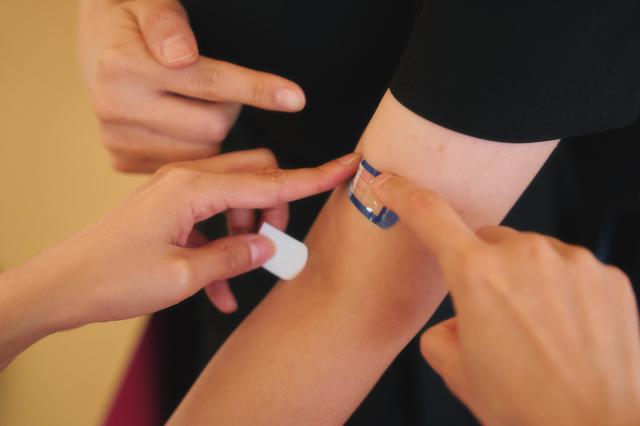 이 패치는 알코올에 관한 체질을 간이로 파악할 수 있는 제품입니다. 피부색에 변화가 없으면 술에 강한 체질, 분홍색이면 술에 약한 체질, 붉은색으로 변하면 술을 전혀 마실 수 없는 체질로 분류한다고 하네요. 제 팔에 붙인 지 20분이 지나자 피부색이 분홍색에 가깝게 변했습니다.