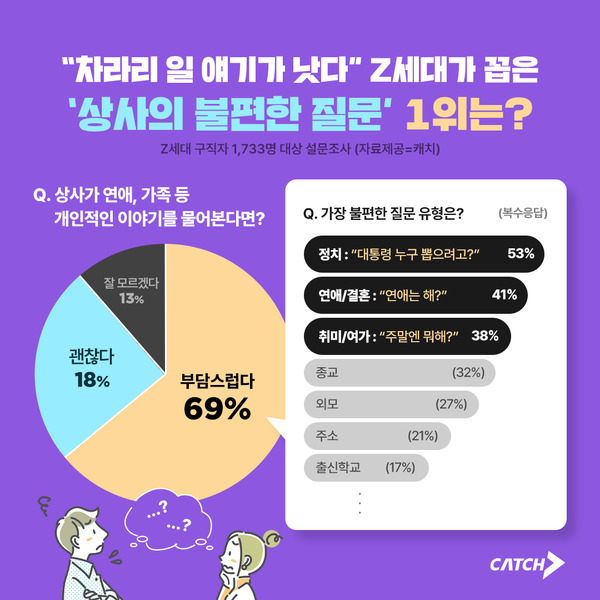 또한 “연애는 하느냐” 같은 사적인 질문(41%), “주말에 뭐 했느냐” 등 여가 활동에 대한 질문(38%)도 주요 불편 요소로 꼽혔다.