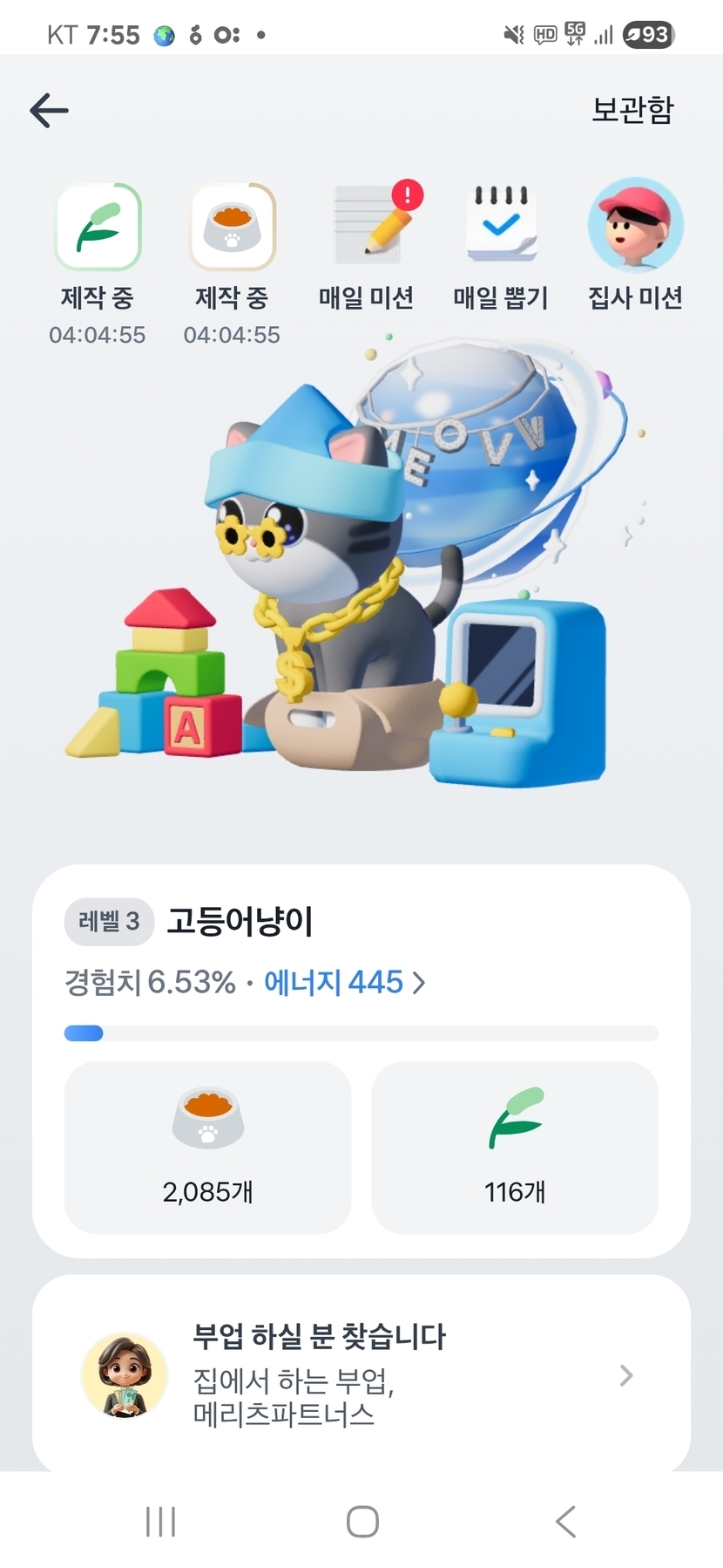 25.08.12 83 읽음 고양이 키우기 pohang101 구독하기 4 6 콘텐츠의 수익 3 집사미션만큼만 할당된 양으로 먹이주고 놀아주면서 장난감과 먹이모으기ㅎㅎ 6 0 / 300 입력