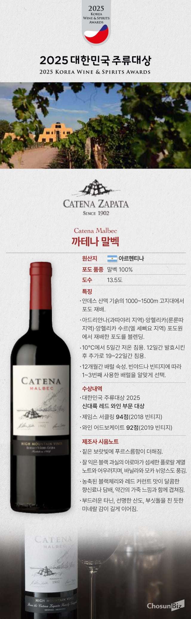 이러한 혁신의 결정체가 아르헨티나의 ‘국민 품종’ 말벡의 품질을 세계에 알린 ‘까테나 말벡(Catena Malbec)’이다. 까테나 말벡은 멘도사의 아드리안나(과따야리), 앙헬리카(룬룬따), 앙헬리카 수르(엘 세삐요) 포도원 등 고도와 기후가 뚜렷이 다른 3개 지역의 포도를 블렌딩해 만든다. 고도가 높은 아드리안나 포도밭(해발 1450m)에서 오는 생동감 있는 산도와 미네랄, 룬룬따 지역 앙헬리카 포도밭의 농익은 과실미, 엘 세삐요 지역의 앙헬리카 수르 포도밭에서 오는 허브와 스파이시한 뉘앙스가 한 병 안에서 균형을 이룬다. 포도가 자라는 정확한 위치와 고도, 그리고 다양한 떼루아 속성을 모두 반영해, 한 병에 아르헨티나 말벡의 다층적인 매력을 균형 있게 담아낸 것이다.