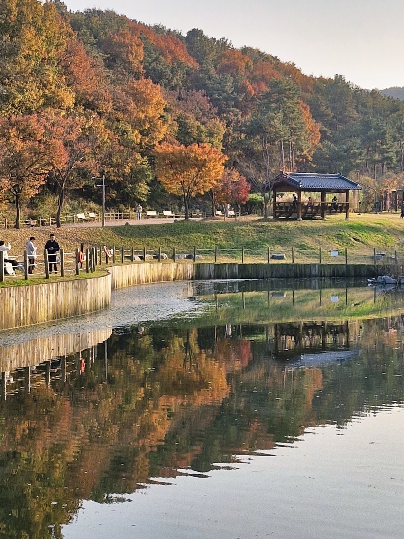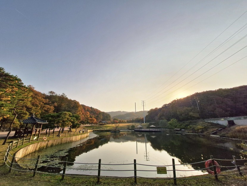 호수에 노을이 내려앉네요