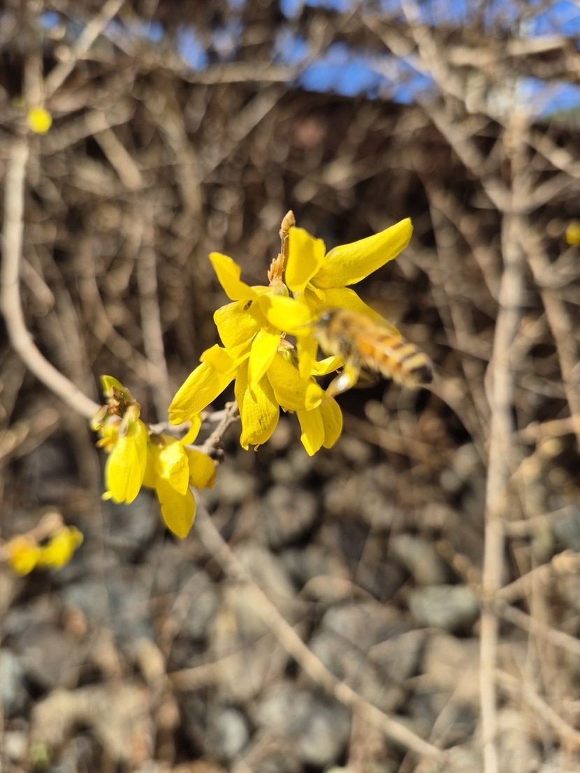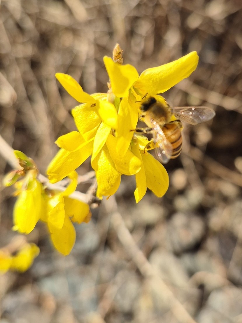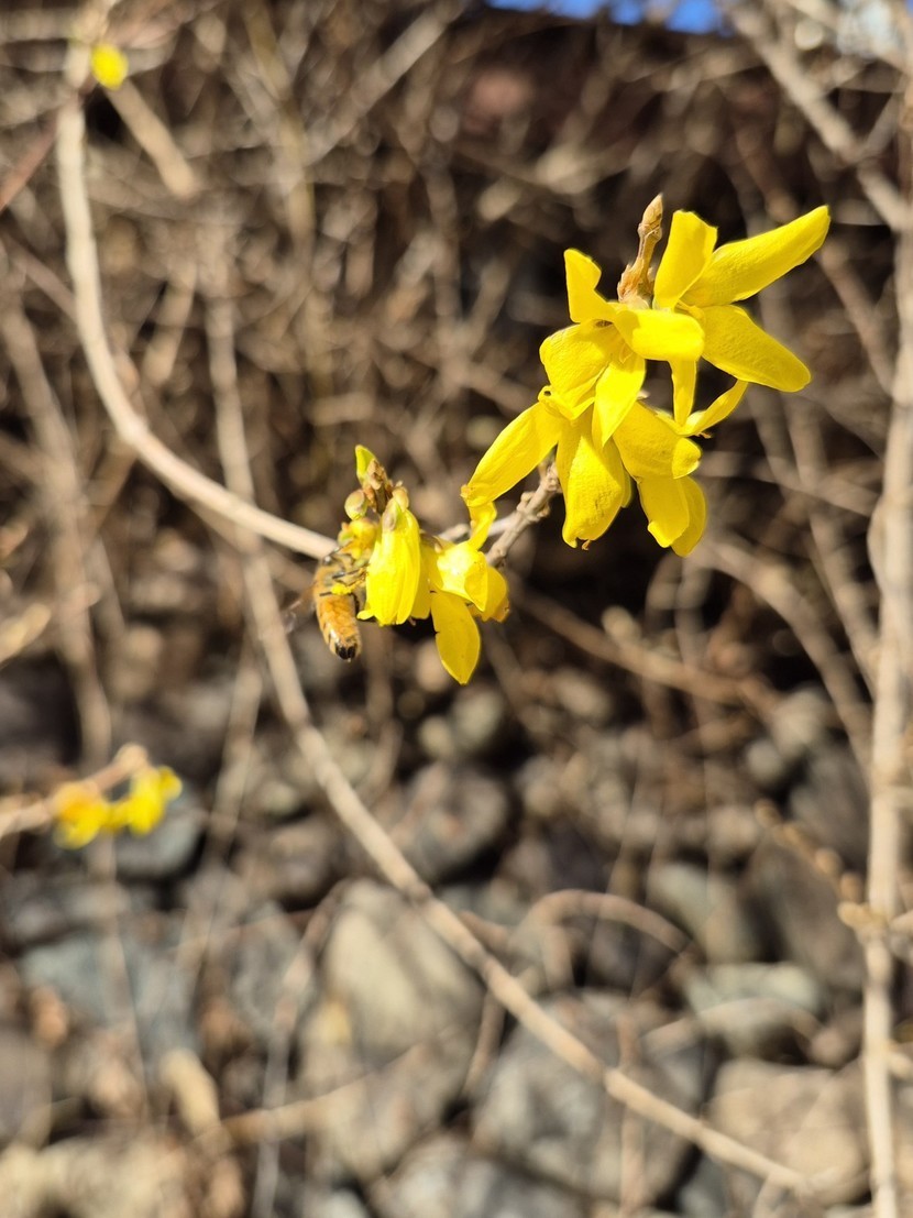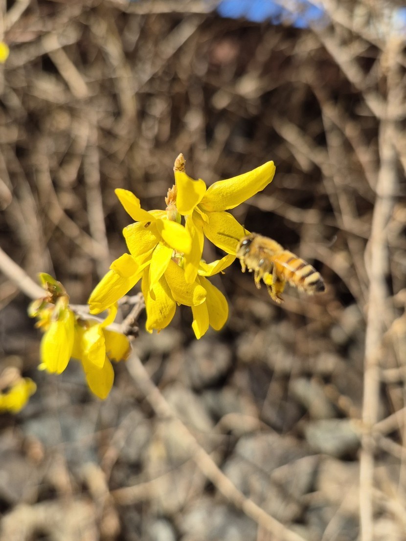봄날같았던 휴일 양지바른곳에 개나리가 피어있어요. 예쁜벌님이 귀여워요