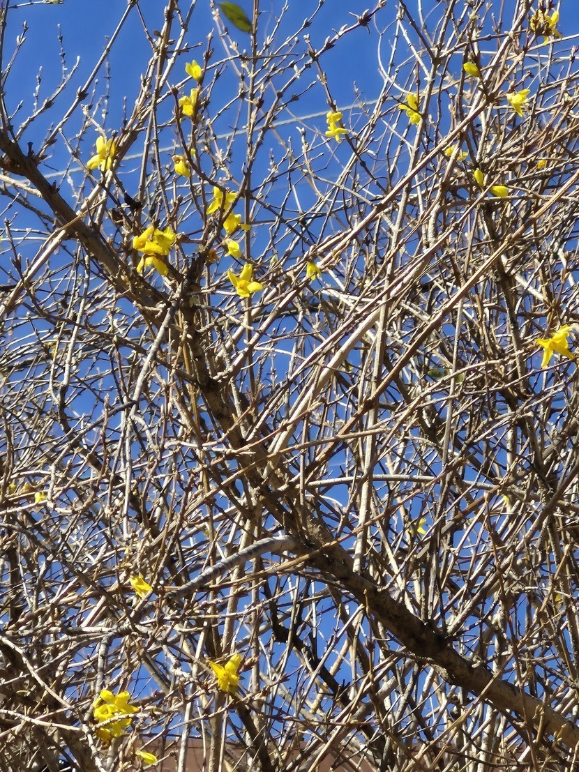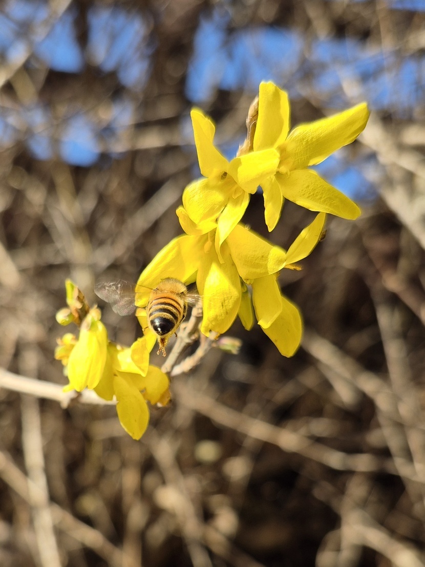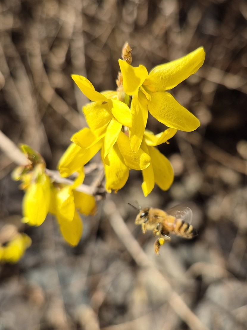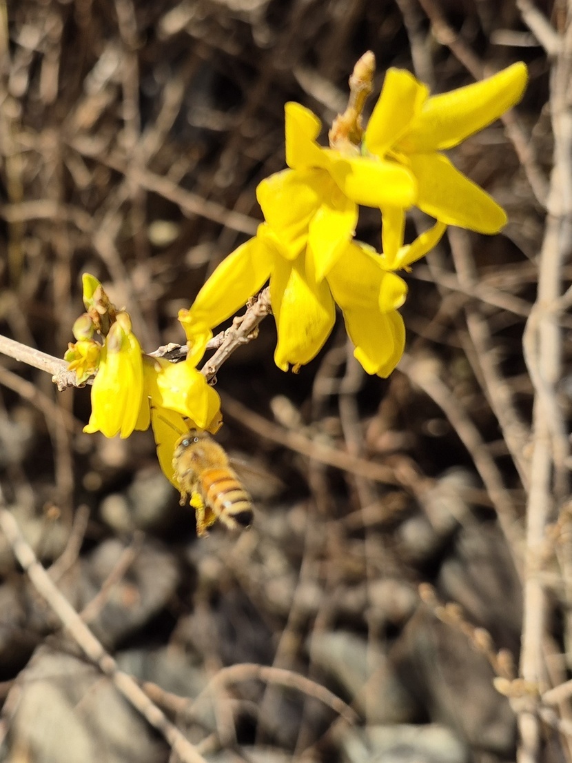 봄날같았던 휴일 양지바른곳에 개나리가 피어있어요. 예쁜벌님이 귀여워요
