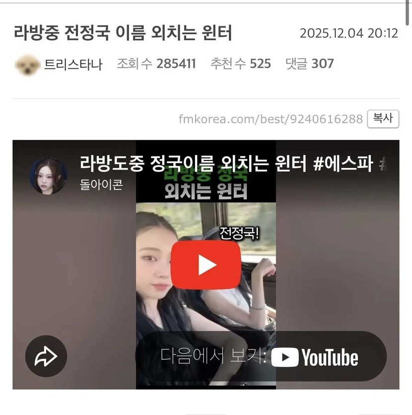 온라인 커뮤니티에는 ‘라방 도중 정국 이름 외치는 윈터’라는 제목의 영상도 게시됐다. 영상에는 윈터가 라이브 방송 중 "전정국"이라고 말하는 장면이 담겨 있다.