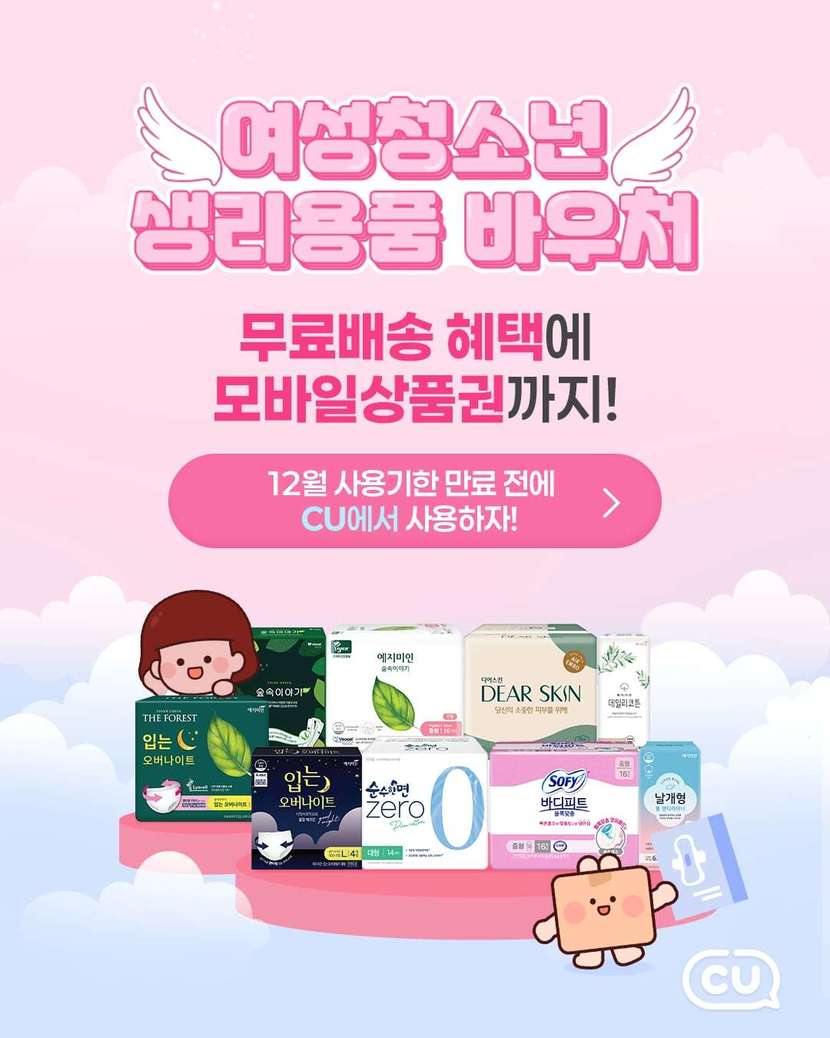 CU는 바우처 사업을 진행 중인 전국 48개 시·군 지역 내 점포와 자체 어플리케이션(앱) 포켓CU를 통해 생리대, 위생팬티 등 70여 종의 위생용품을 구매할 수 있도록 하고 있다.