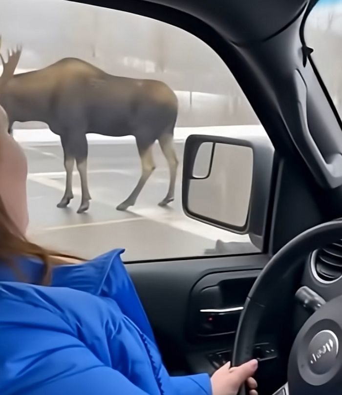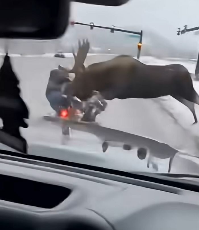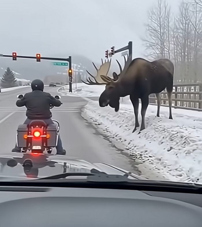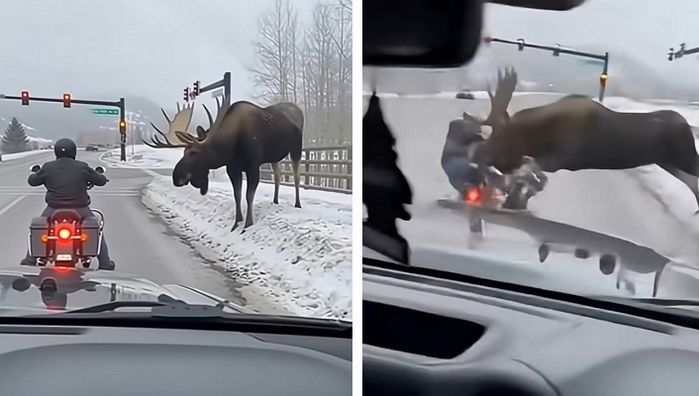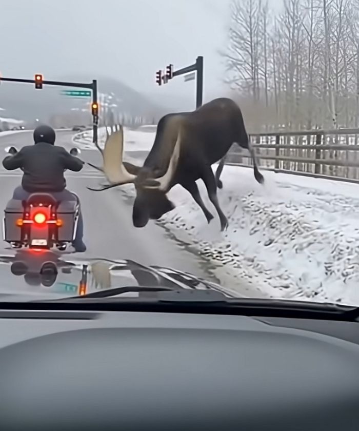 도로가에 멈춰 선 오토바이 운전자가 거대한 말사슴(무스)에게 반가운 인사를 건네려던 찰나, 1초 뒤 벌어진 상황은 현장을 지켜보던 모두를 경악게 했습니다.