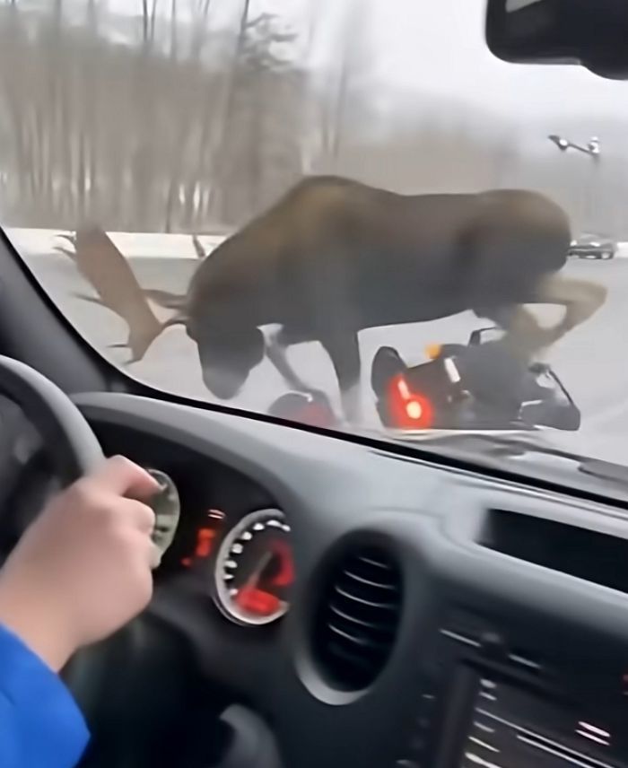 웬만한 트럭만 한 덩치를 가진 말사슴의 강력한 몸싸움에 오토바이는 힘없이 쓰러졌고, 운전자는 아스팔트 바닥으로 나뒹굴었습니다.