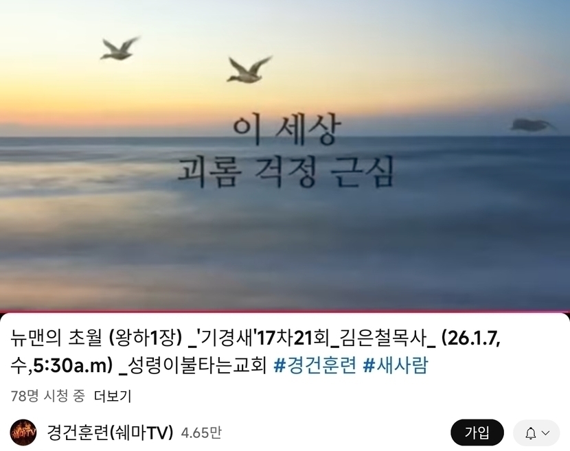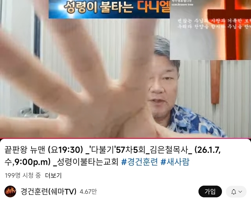 3일 전 152 읽음 176.2026.1.7.수 다니엘기도회 새벽기도회 성령이불타는교회 쉐마TV1 구독하기 24 21 콘텐츠의 수익 6 https://www.youtube.com/live/J8PbYSkdzes?si=vPu-w3sxwcd153jghttps://www.youtube.com/live/NVW7WXhadT0?si=zffpBiSkmVlUnofa 21 0 / 300 입력
