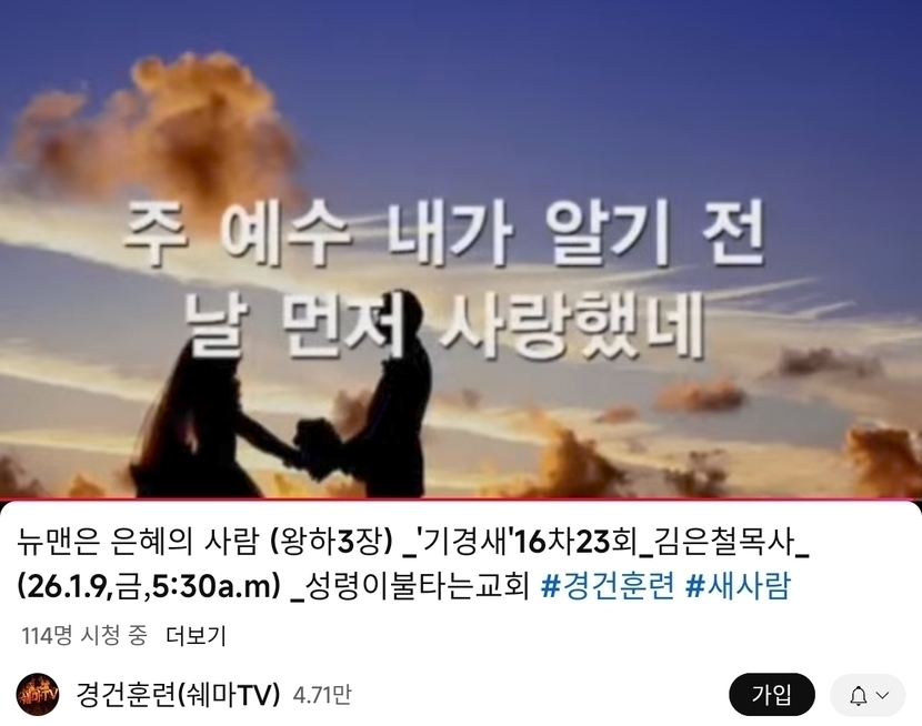 1일 전 131 읽음 178.2026.1.9.금 다니엘기도회 새벽기도회 성령이불타는교회 쉐마TV1 구독하기 31 31 콘텐츠의 수익 5 https://www.youtube.com/live/VSnBT_rSQLA?si=c4i7Ddwbt48CnwEHhttps://www.youtube.com/live/mfRe3pfYN2Y?si=Ayc85axEDfhrpFj7 31 0 / 300 입력