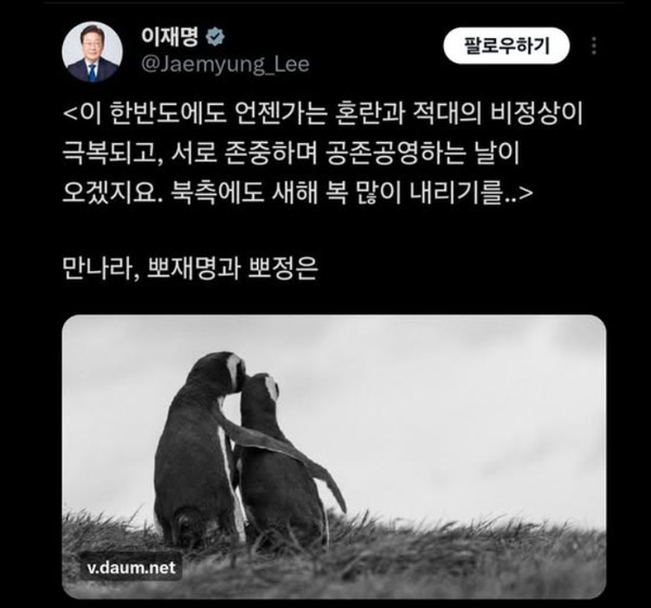 이재명 대통령이 중국 방문 일정 마치고 귀국한 날인 7일 X(구 트위터)에 펭귄이 뽀뽀하는 사진을 올리며 ‘한반도에도 언젠가는 혼란과 적대의 비정상이 극복되고, 서로 존중하며 공존공영하는 날이 오겠지요. 북측에도 새해 복 많이 내리기를'라는 글을 올렸다.