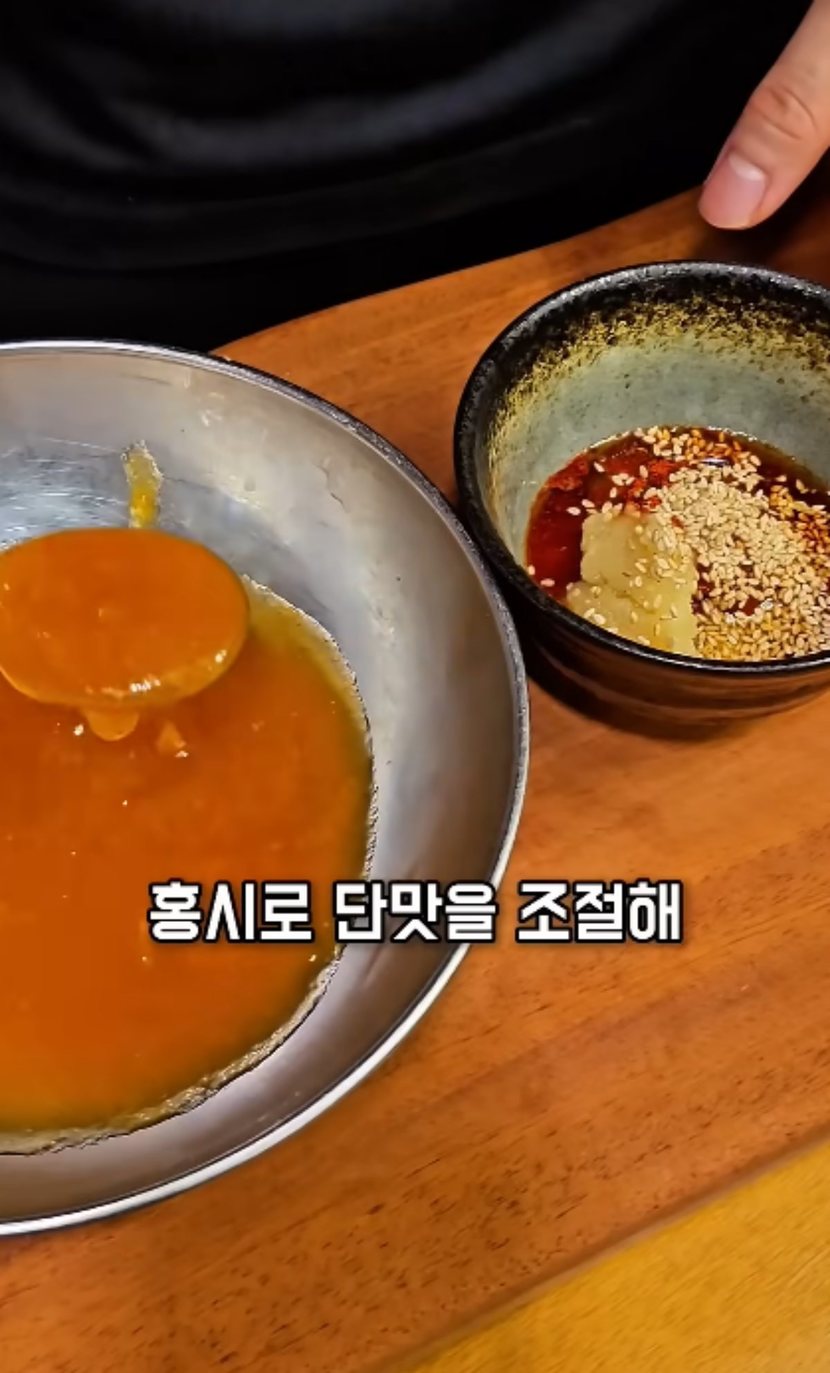 이어지는 양념장 제조 과정에서는 고추장 한 스푼, 진간장 한 스푼, 식초 한 스푼, 참기름 반 스푼, 다진 마늘 반 스푼, 그리고 깨를 듬뿍 뿌려 잘 섞는다. 여기에 앞서 으깨둔 홍시를 넣어 소스의 달달함을 극대화한다. 이때 홍시의 양은 기호에 따라 가감하여 단맛을 조절할 수 있다.
