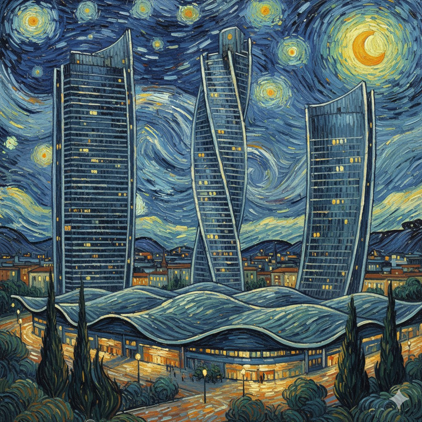 왼쪽의 곧게 뻗은 알리안츠 타워(이소자키 타워), 중앙의 역동적으로 뒤틀린 제네랄리 타워(하디드 타워), 그리고 오른쪽의 부드러운 곡선을 그리는 PwC 타워(리베스킨트 타워)가 고흐 특유의 임파스토(Impasto) 기법으로 그려졌습니다. 각 타워의 창문에서 새어 나오는 노란 불빛은 밤하늘의 별빛과 조화를 이룹니다.