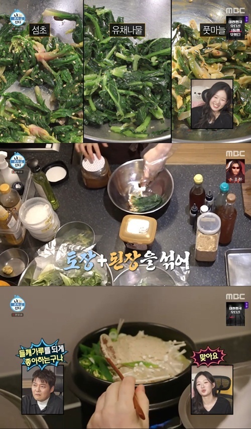 김시현은 "친구들을 초대해 집들이를 하거든요 오늘의 저녁 메뉴는 모시조개를 이용한 솥밥이고요 꽃게를 넣어 만든 들깨 순두부찌개 그리고 네가지 나물이 있는데 봄동 참나물 겉절이, 섬초 된장 무침, 유채나물, 풋마늘"라고 소개했다.