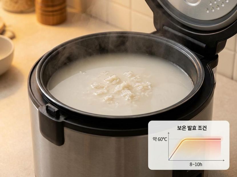 데운 밥을 밥솥에 넣고 물 한 컵 정도를 먼저 부어 숟가락으로 뭉친 곳 없이 풀어준다. 이후 누룩과 남은 물, 소금을 넣고 가볍게 섞는다. 이 상태에서 밥솥의 보온 버튼을 누른다. 다만 밥솥마다 보온 온도가 다른 만큼, 내부 온도가 너무 높아지지 않도록 뚜껑 사이에 두툼한 행주를 끼워 약 60도 수준을 유지하는 것이 좋다.