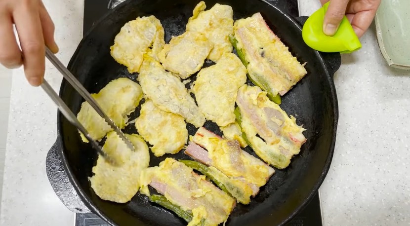 약 1~2분 정도 지나면 팬 안의 물이 대부분 증발한다. 이때 뚜껑을 열고 불을 중불로 올린다. 팬에 남아 있는 수분이 완전히 사라지면서 전의 겉면이 다시 기름에 구운 듯한 질감으로 변한다. 이미 전 자체에 기름이 배어 있기 때문에 별도의 식용유를 추가하지 않아도 표면이 노릇하게 살아난다.
